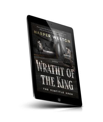 “A dark, eerie room with a ghostly figure and a seated girl, showcasing a horror book cover titled "Wrath of the King".”