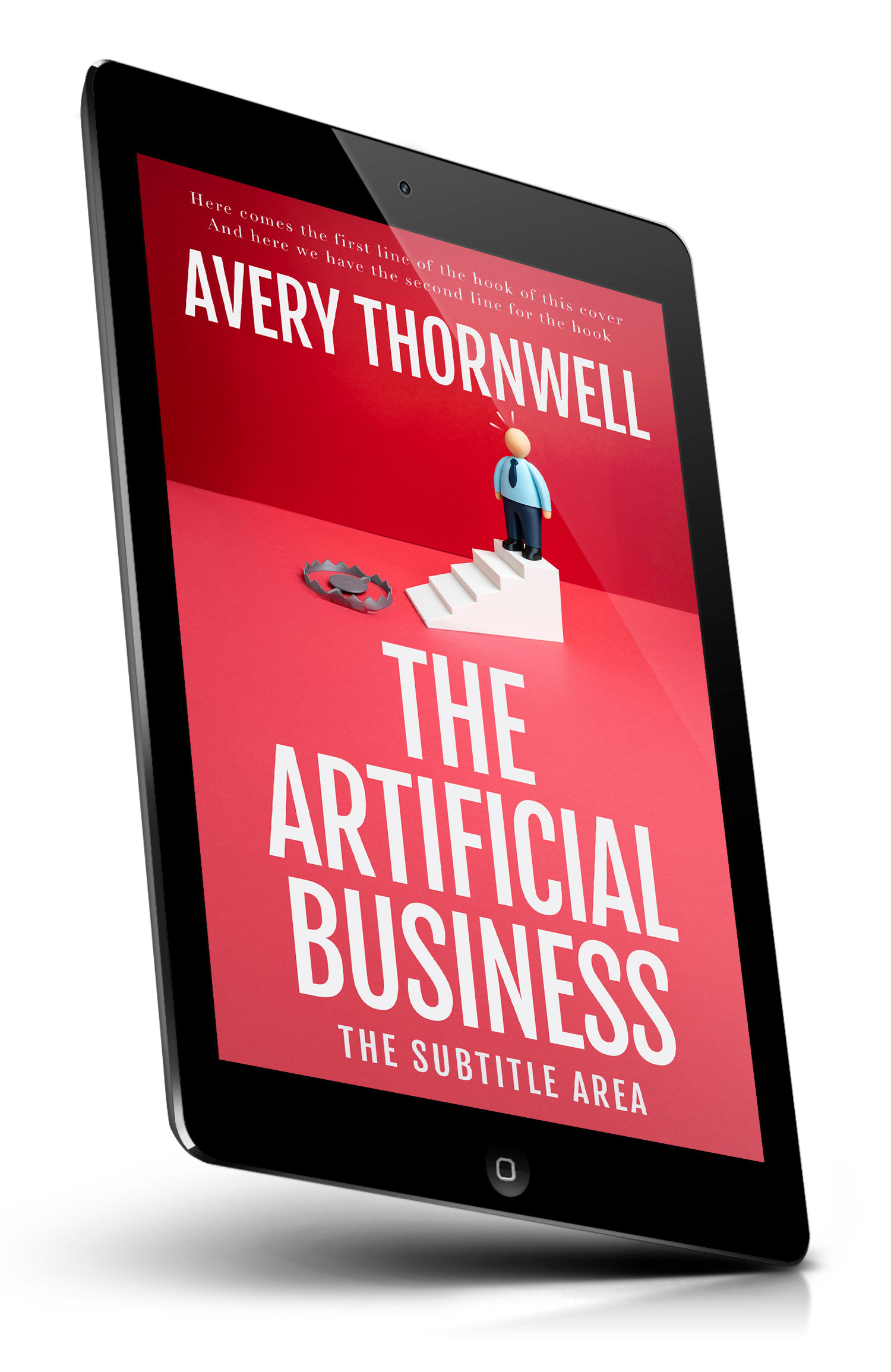 “A toy-like businessman stands atop white steps on a red background, with a metal bear trap on the floor nearby.”