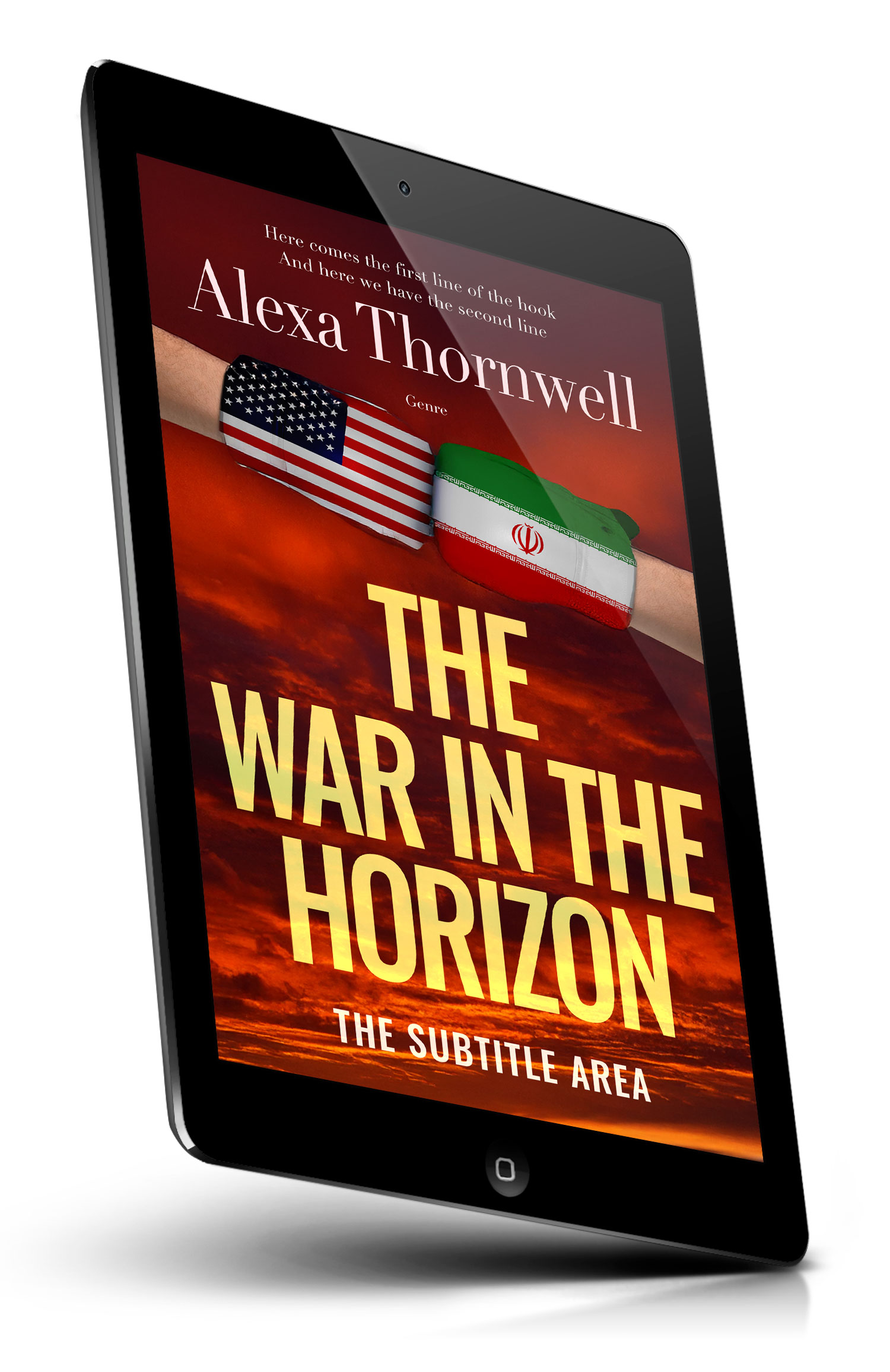 Tags: war, conflict, boxing gloves, fistfight, usa flag, iran flag, political thriller, international tension, diplomacy, sanctions, rivalry, geopolitics, confrontation, national symbols, red sky, dramatic clouds, aggression, military threat, crisis, global politics, premade cover, book cover design, self-publishing, ebook cover, print ready