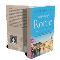 “A serene view of Rome with a river, historic buildings, and pink flowers in the foreground under a blue sky.”