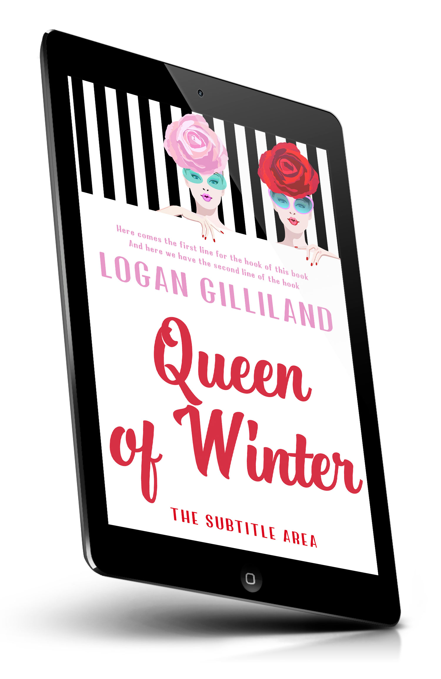“Stylized book cover with two women in glasses and rose hats against black stripes, hands on a white panel.”