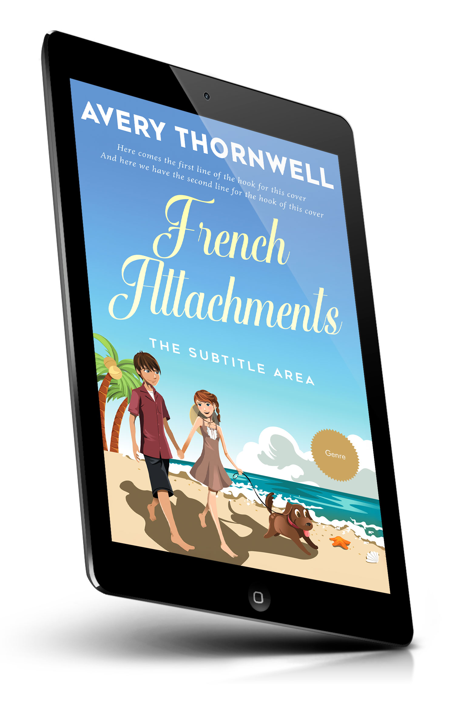 “Illustrated book cover of a couple holding hands walking a dog on a sunny beach with palm tree, waves, and seashells.”