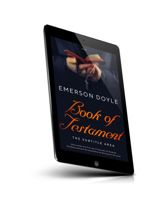 “Person holding a small open book and a rosary with a crucifix, under text "Emerson Doyle - Book of Testament - The Subtitle Area."”