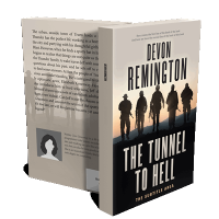 “Silhouettes of soldiers walking at sunset with bold text above and below.”