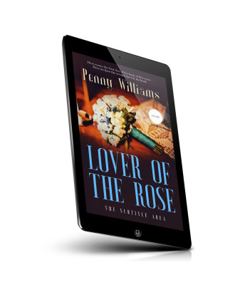 “A bouquet of flowers on a wooden table with a lace cloth, and a book cover text overlay describing "Lover of the Rose" by Penny Williams.”