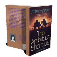 “Two figures push puzzle pieces together beneath a dramatic sky. Title "The Ambitious Shortcuts" with author's name on top.”
