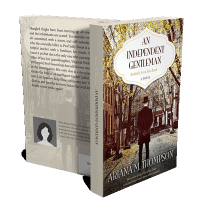 “A man in a suit and hat stands on a tree-lined street, with historic buildings and autumn leaves around.”
