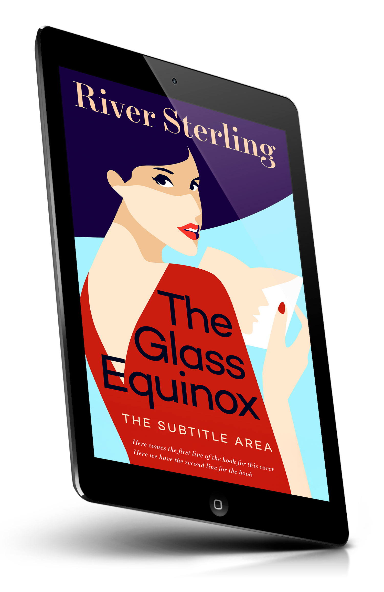 “Stylized book cover illustration of a woman in a red dress with dark hair, holding a glass, against a light blue background.”