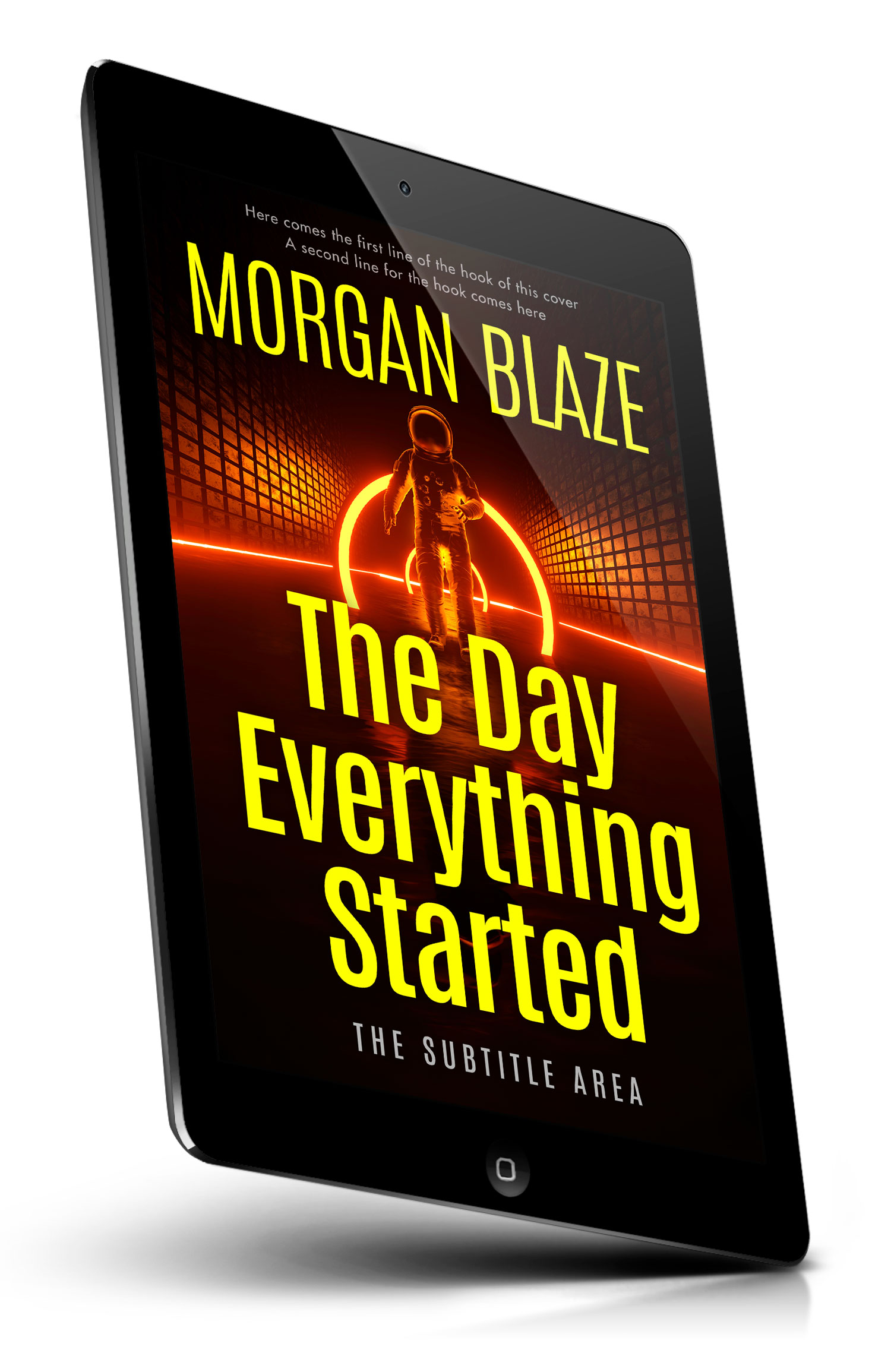 Tags: astronaut, spacesuit, sci-fi, science fiction, spacewalk, futuristic, neon glow, orange light, glowing rings, dark corridor, tunnel, grid walls, perspective, silhouette, backlit, dystopian, cyberpunk, alien world, space adventure, mysterious journey, premade cover, book cover design, self-publishing, ebook cover, print ready