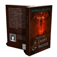 “A fiery, winged figure emerges from flames on a dark, dramatic book cover titled "A Desert of Secrets."”