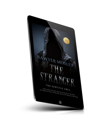 “A mysterious hooded figure in dark clothing on the cover of a book titled "The Stranger."”