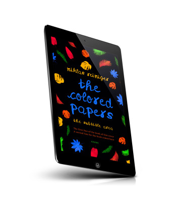 “A book cover with colorful leaves and feathers on a black background, featuring playful, handwritten fonts.”