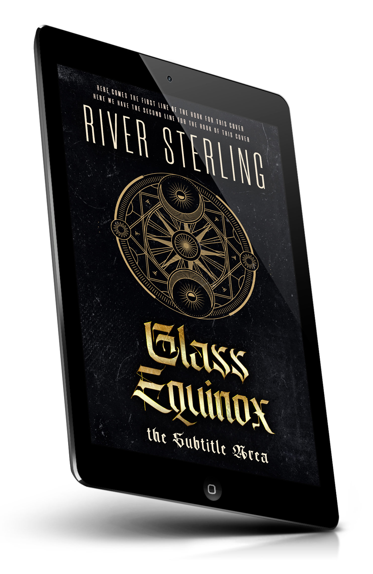 Tags: dark, gold, celestial, occult, sigil, rune, alchemy, mystic, esoteric, astrology, moon phases, sacred geometry, geometric emblem, arcane symbol, magic circle, compass rose, grunge texture, black background, fantasy novel, gothic typography