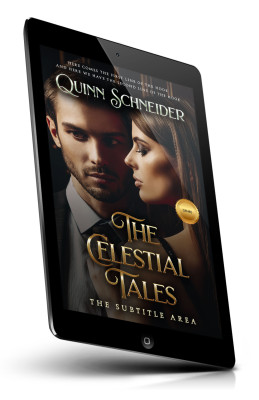 “A close-up of a man in a suit and a woman facing each other, with "The Celestial Tales" title in gold below them.”