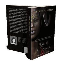 “A cover featuring a person with decorative facial paint, a horn, and a dark background. Title: "War of Alliances".”