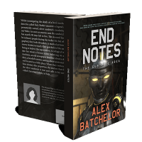 “A robotic figure with a glowing face is depicted on the cover of a book titled "End Notes" by Alex Batchelor.”