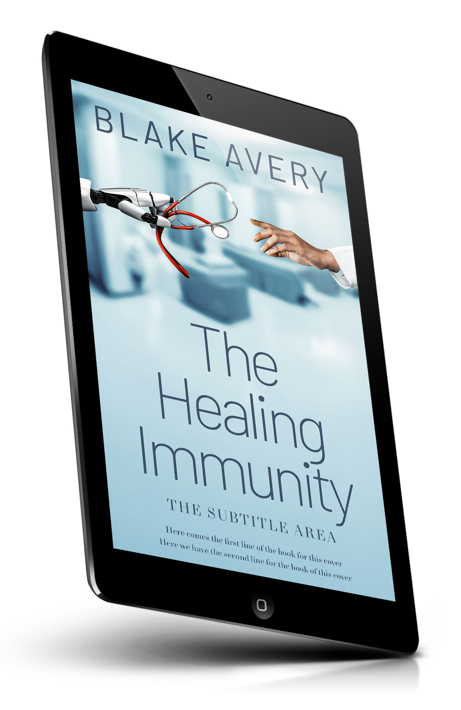 “A robot hand offers a stethoscope toward a human hand reaching back, set against a blurred hospital room background.”