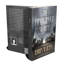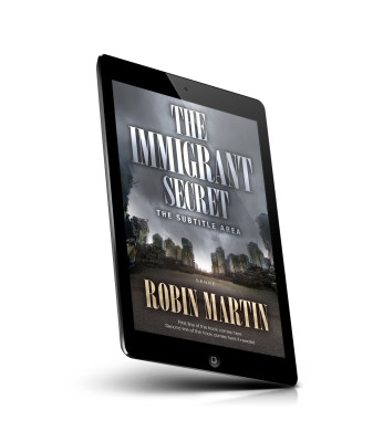 “A post-apocalyptic cityscape with crumbling buildings and a cloudy sky, featuring the title "The Immigrant Secret" in bold letters.”