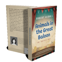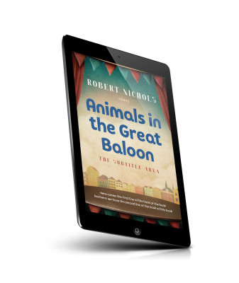“A book cover with a circus tent design, colorful houses at the bottom, and the title "Animals in the Great Baloon."”
