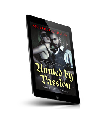 “A mysterious couple in a dark, moody setting; the man in a suit holding the woman, who is wearing a blindfold and a revealing outfit.”