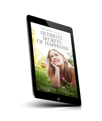 “A woman lying on grass looking up, smiling, with trees and a park in the background. Book cover with title "Ultimate Secrets of Happiness."”