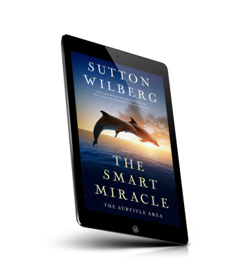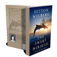 “Two dolphins leap out of water at sunset, with the title information of a book overlaying the image.”