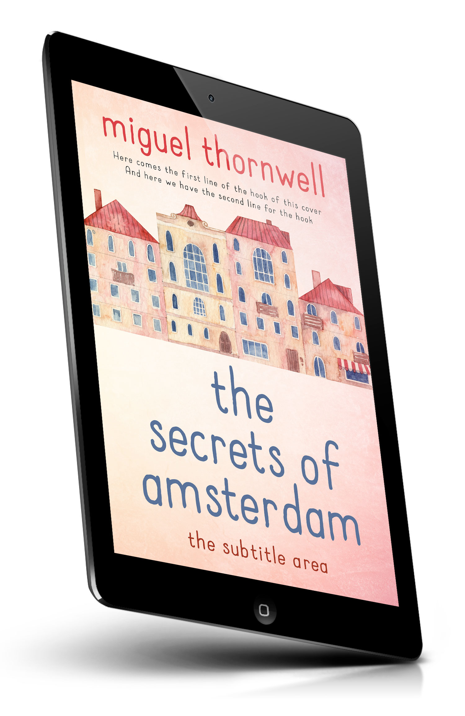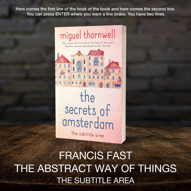 Tags: watercolor, pastel, illustrated, cityscape, amsterdam, dutch houses, canal houses, row buildings, european architecture, red roofs, tall windows, quaint, charming, travel, cozy, bookstore, storefront awning, hand-drawn, soft texture, whimsical, premade cover, book cover design, self-publishing, ebook cover, print ready
