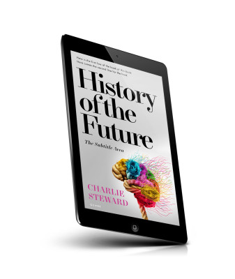 “Colorful brain with wires on a book cover titled "History of the Future" by Charlie Steward.”