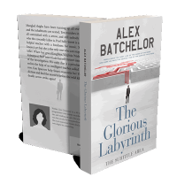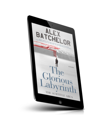 “A man in a suit stands in front of a large, abstract labyrinth with paths in red and white. The background is minimalistic and monochrome.”