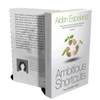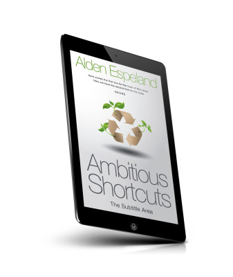 “Cover design with a prominent recycling symbol made of brown wood with green leaves, and the title "Ambitious Shortcuts" in large text below.”