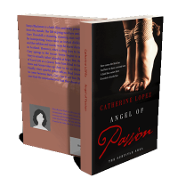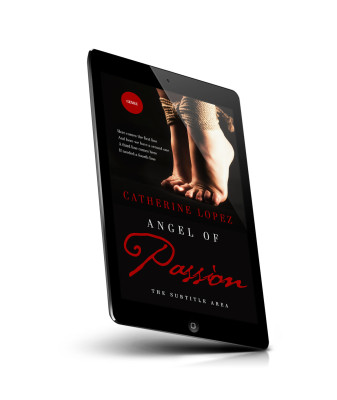 “The image shows a book cover with bound feet, a red "Genre" circle, and the title "Angel of Passion" by Catherine Lopez.”