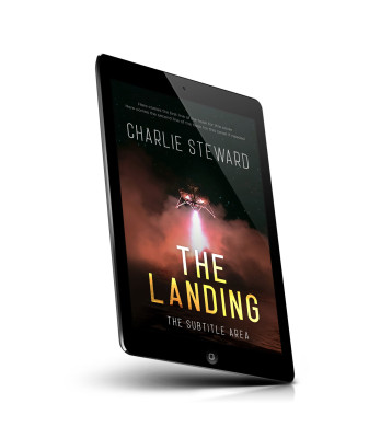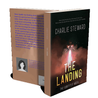 “A spacecraft descends with bright thrusters against a dark, cloudy backdrop. Title and author name are prominent.”