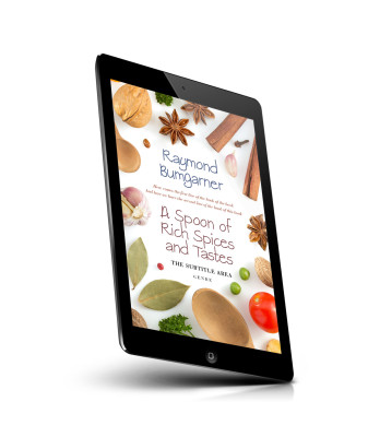 “An assortment of spices, herbs, and wooden spoons arranged around the cover of a book.”