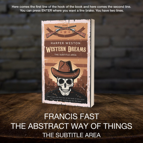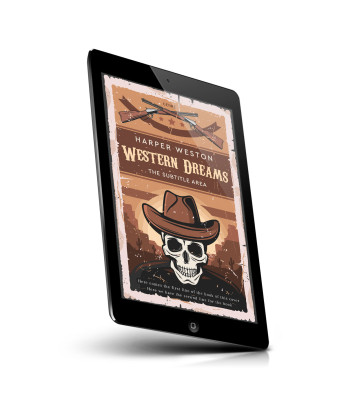 “A vintage-style book cover featuring a skull wearing a cowboy hat against a desert backdrop with cacti. Guns are crossed at the top.”