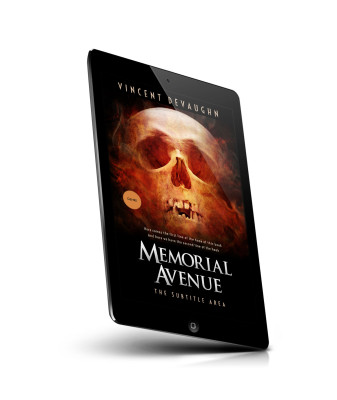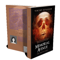 “A fiery skull dominates the dark, eerie book cover with "Memorial Avenue" prominently displayed below.”