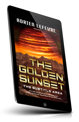 “A giant planet with red and orange hues looms over mountainous terrain under a starry sky. Title text dominates the lower half.”