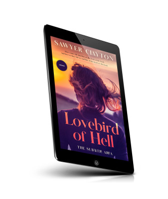 “A person with flowing hair faces a sunset sky. The text "Lovebird of Hell" is featured prominently.”