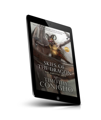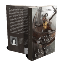“A fierce dragon with glowing eyes and sharp teeth, wielding a weapon, dominates the cover of the book "Skies of the Dragon."”