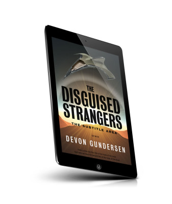 “A futuristic spaceship flies over a sunlit landscape with mountains. The image features bold, prominent text for a book cover.”