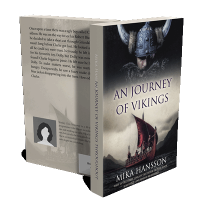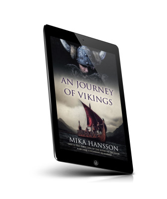 “A Viking warrior with a helmet is above; below, a Viking ship with red sails navigates through water.”