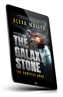 “A futuristic scene with a robot aiming a weapon in a high-tech spaceship, featuring bold title text "The Galaxy Stone".”