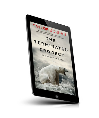“A roaring polar bear stands amidst icy water under a cloudy sky. Book title and author are centered above.”