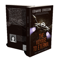 “A spaceship with glowing engines flies through space. The background has stars, and the foreground features a book title in bold letters.”