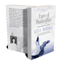 “A woman in a white dress stands on rocks by the water, facing away from the viewer. The book title and author's name are displayed above.”