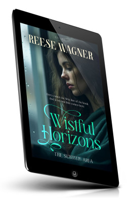 Tags: wistful, horizons, book, cover, woman, window, rain, reflection, somber, green, title, author, reese, wagner, genre, moody, contemplative, typography, subtitle, text