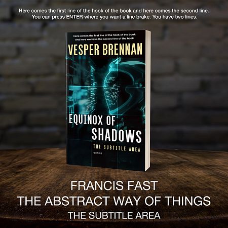 This book cover has 2 lines for the title, 1 line for the subtitle, 1 line for the author, 2 lines for the hook, and finally 1 line for the genre.
