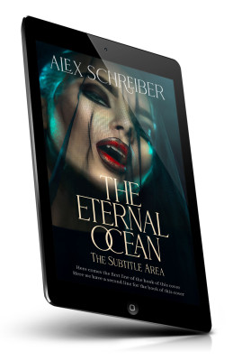 “A person with a veil, dramatic makeup, and vibrant red lipstick is on the cover of a book titled "The Eternal Ocean."”