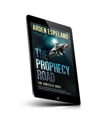 “A spaceship with bright lights flies through a stormy sky. The title "The Prophecy Road" is prominent in large blue letters.”