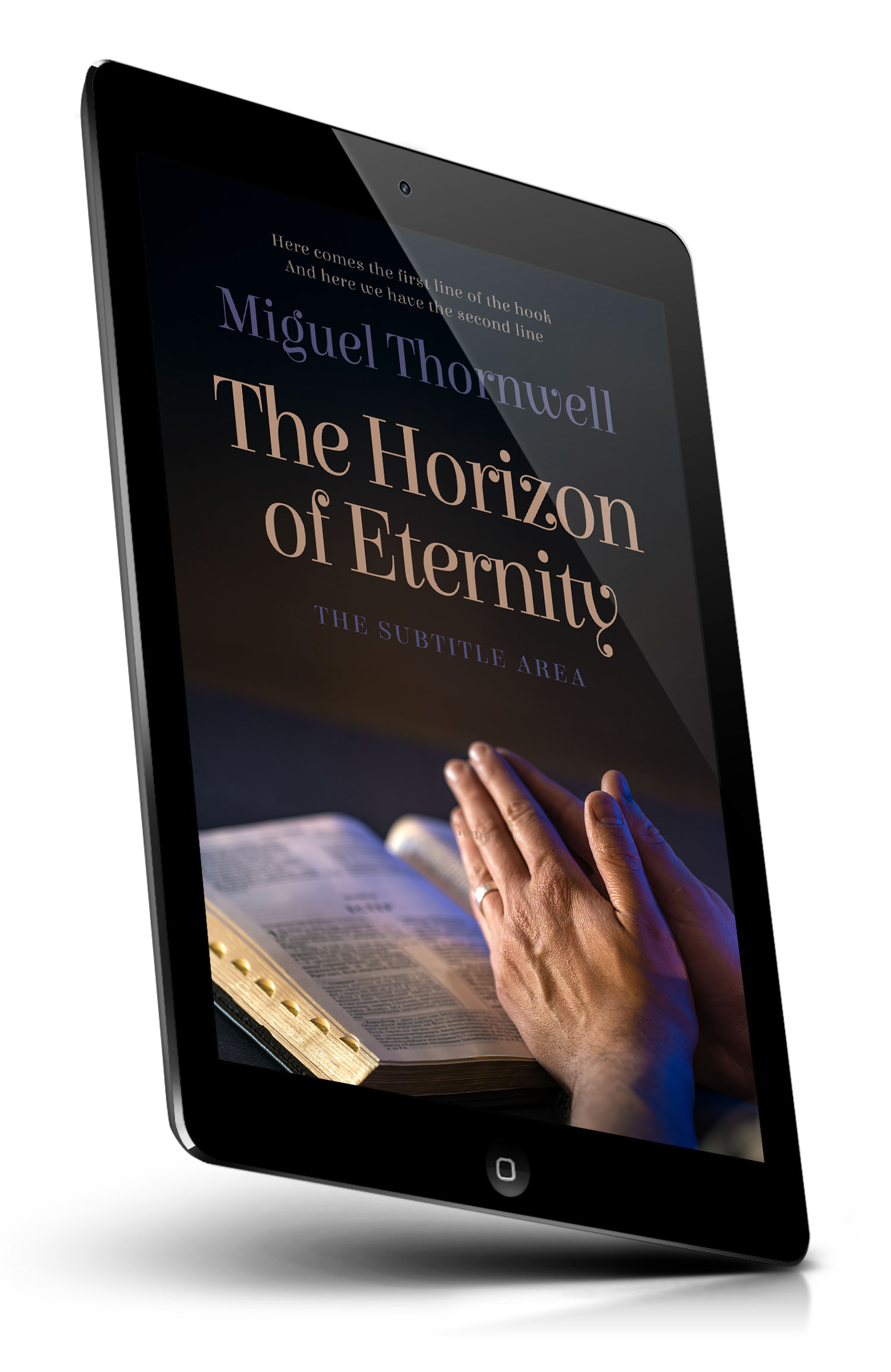 Tags: prayer, praying hands, clasped hands, devotion, faith, spirituality, religion, worship, meditation, contemplation, hope, serenity, divine, sacred, scripture, holy book, open bible, bible study, church, solemn mood, premade cover, book cover design, self-publishing, ebook cover, print ready