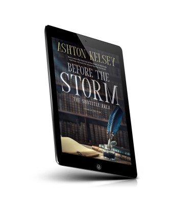 “Book cover with shelves of books in the background and a blue quill pen in the foreground.”